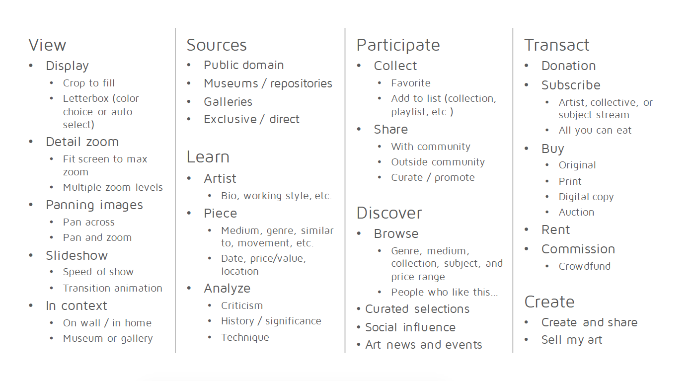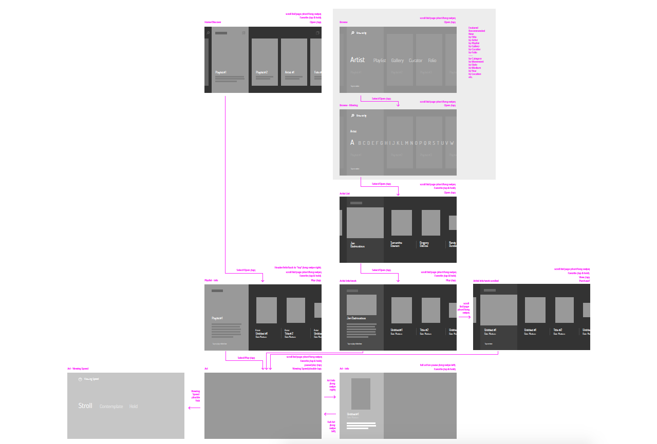 Art could be admired or interacted with using a unique wall-mounted touch-sensitive controller, a nod to art gallery plaques. Examining other digital art frame products, art-centered apps and services, and streaming set-top boxes, we were able to shape an identity and solidify our ideas into a satisfying experience.